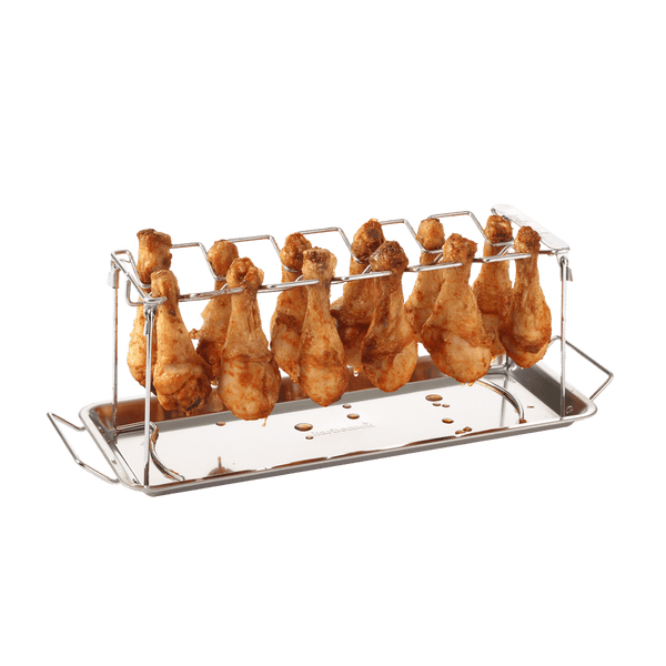 Utilisez le support pratique pour cuisses de poulet de Barbecook pour préparer jusqu'à 12 cuisses de poulet simultanément. Comprend un bac récupérateur de graisse pour récolter les sucs de la viande.