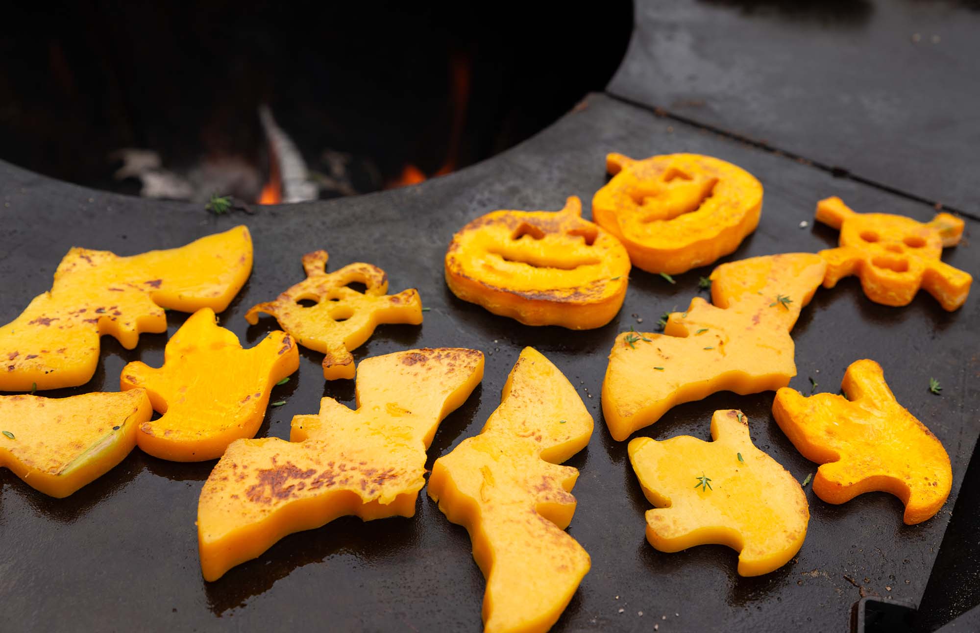 Étalez la pâte à pizza et découpez des formes amusantes d'Halloween. Nos formes préférées sont les fantômes et les citrouilles. Saupoudrez généreusement le bas des mini-pizzas de farine et garnissez les formes de sauce tomate et de morceaux de chorizo, puis terminez avec de la mozzarella râpée. Placez les pizzas sur la spatule à pizza Barbecook et enfournez les dans le four à pizza Nestor préchauffé pendant environ 1 minute.
