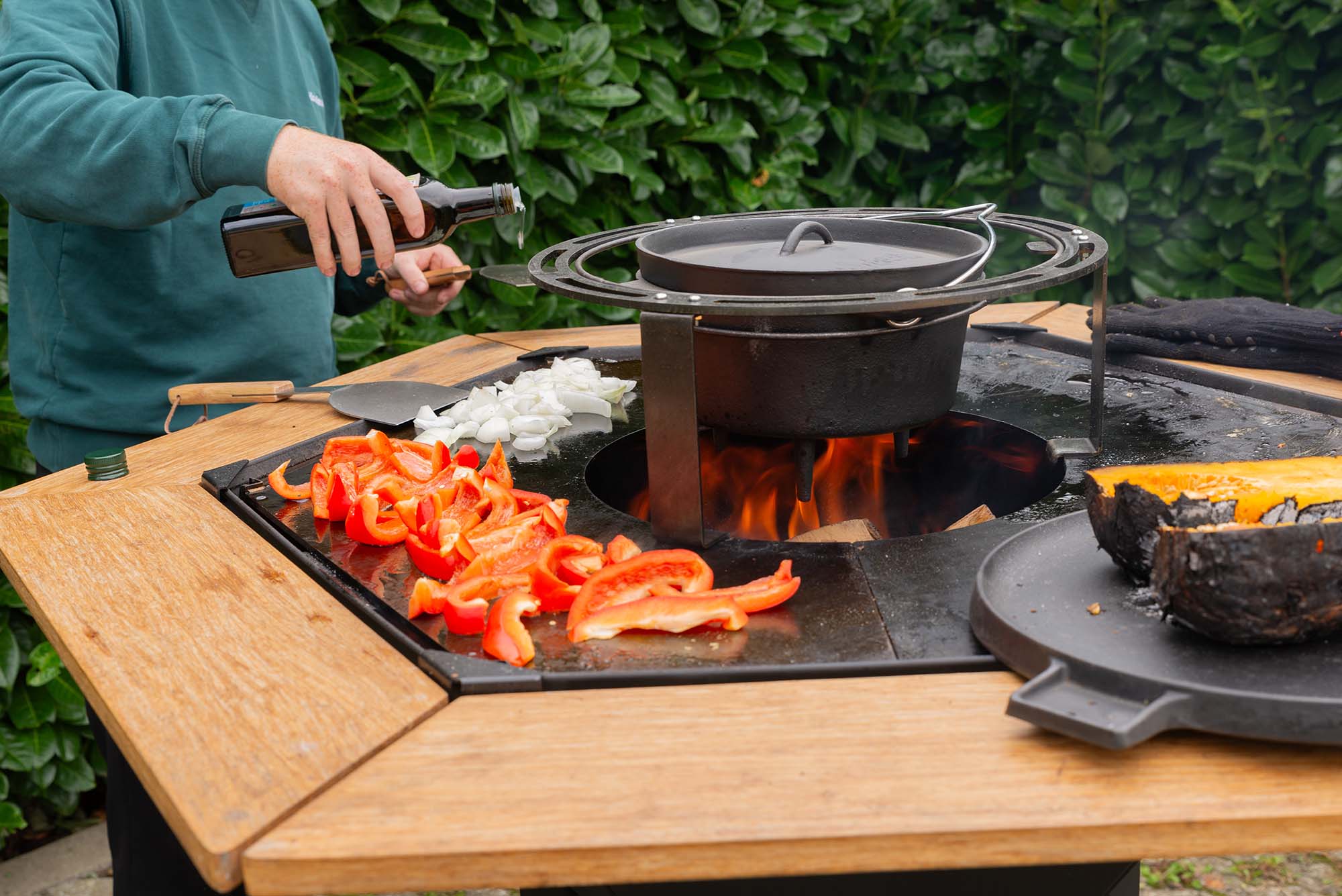 Ensuite, vous pouvez vous occuper des autres légumes. La table d'appoint en bambou Barbecook vous facilitera la vie dans cette situation.Enduisez la grille en fonte du Nestor d'huile de tournesol. Pour cela, vous pouvez utiliser l'une des spatules Barbecook. Hachez un oignon et un poivron rouge et faites-les griller sur les plaques de cuisson.
