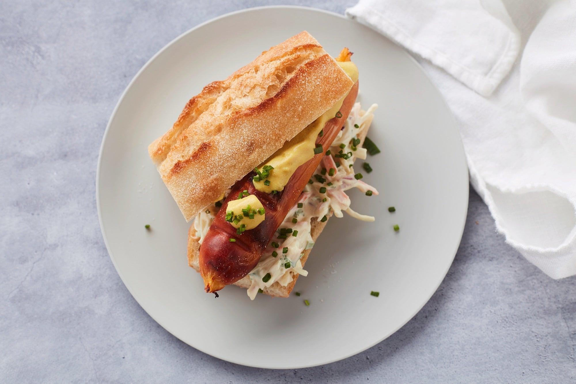 Après cela, vous pouvez commencer à préparer les hot-dogs. Recouvrez la baguette d'une saucisse, d'oignons caramélisés, de quelques cuillères de salade de chou et de mayonnaise aux cornichons. Terminez avec quelques oignons bicky et/ou de la ciboulette.