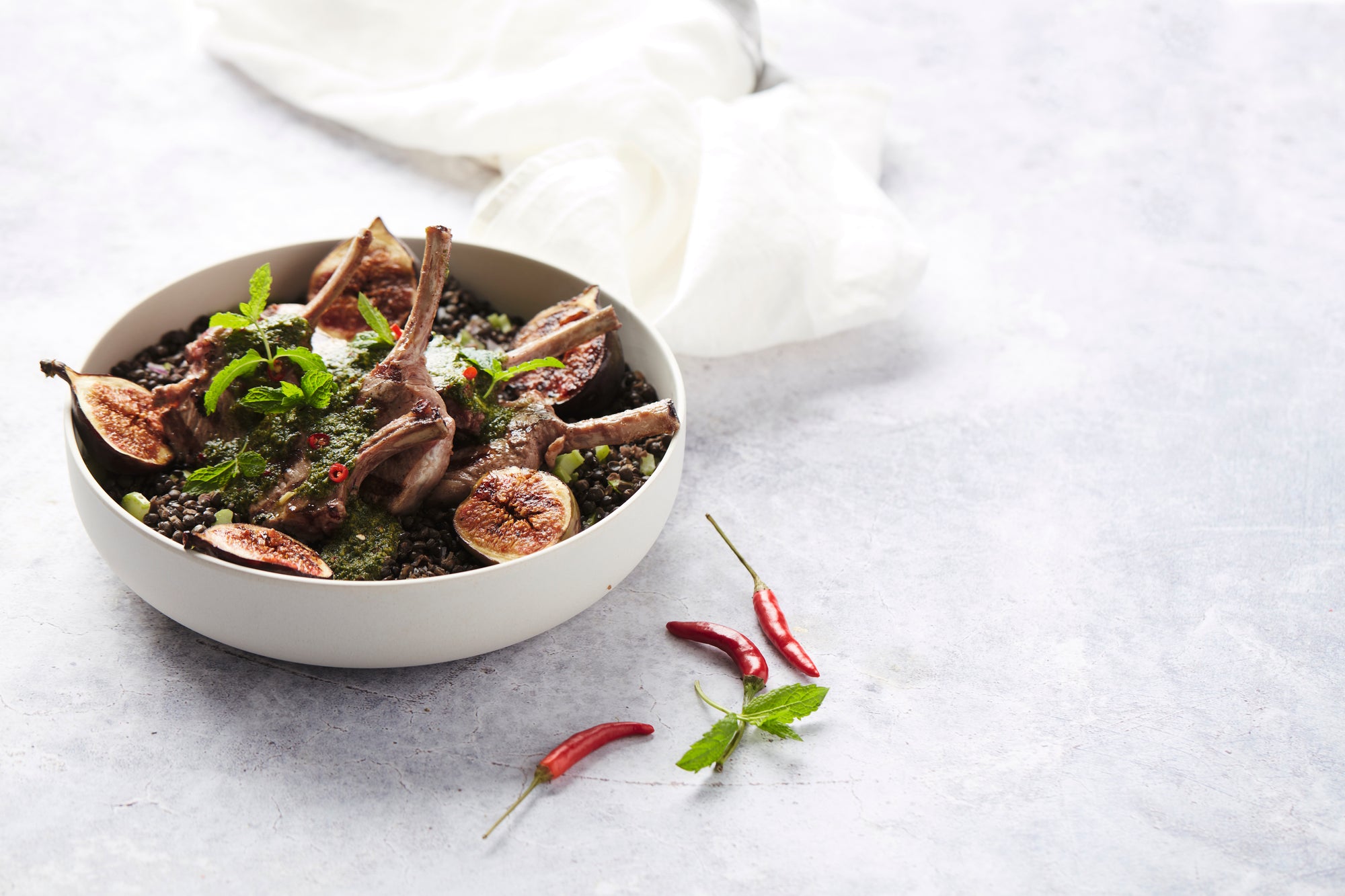 Disposez les mignonettes d'agneau grillées et les figues sur la salade de lentilles. Arrosez d'un peu de vinaigrette et servez le reste de la vinaigrette dans un petit bol à côté.