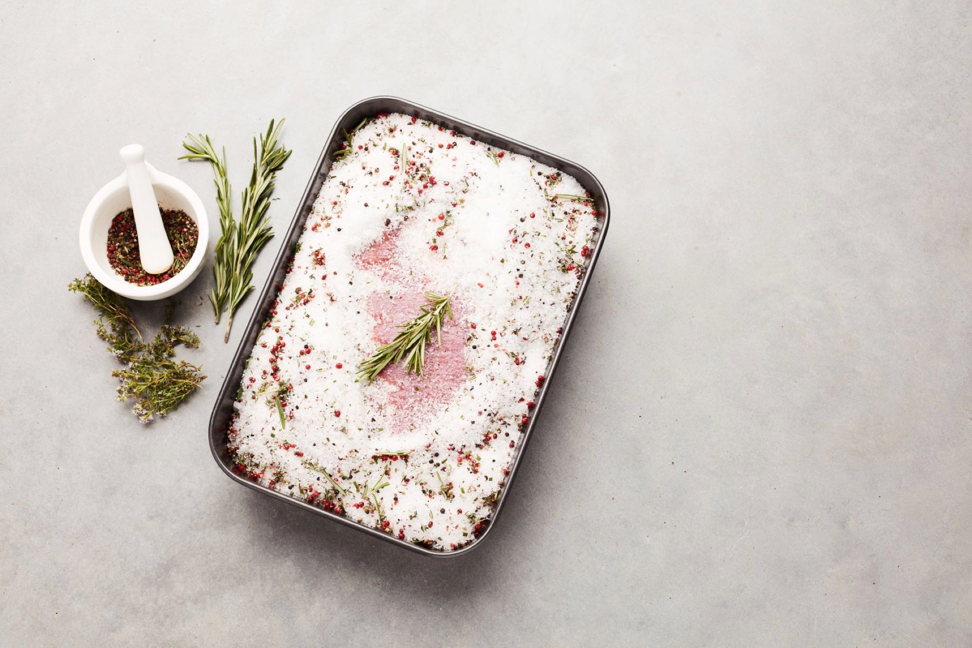 Pour le fumage à chaud, nous recommandons de saumurer le saumon au préalable. Pour ce faire, placez le saumon dans un mélange de sel et d’épices pendant un certain temps. Pour cette recette de saumon fumé, nous utilisons les assaisonnements suivants : baies de genièvre, graines de fenouil et grains de poivre. Écrasez les épices dans un mortier et mélangez-les avec le sel et le sucre.