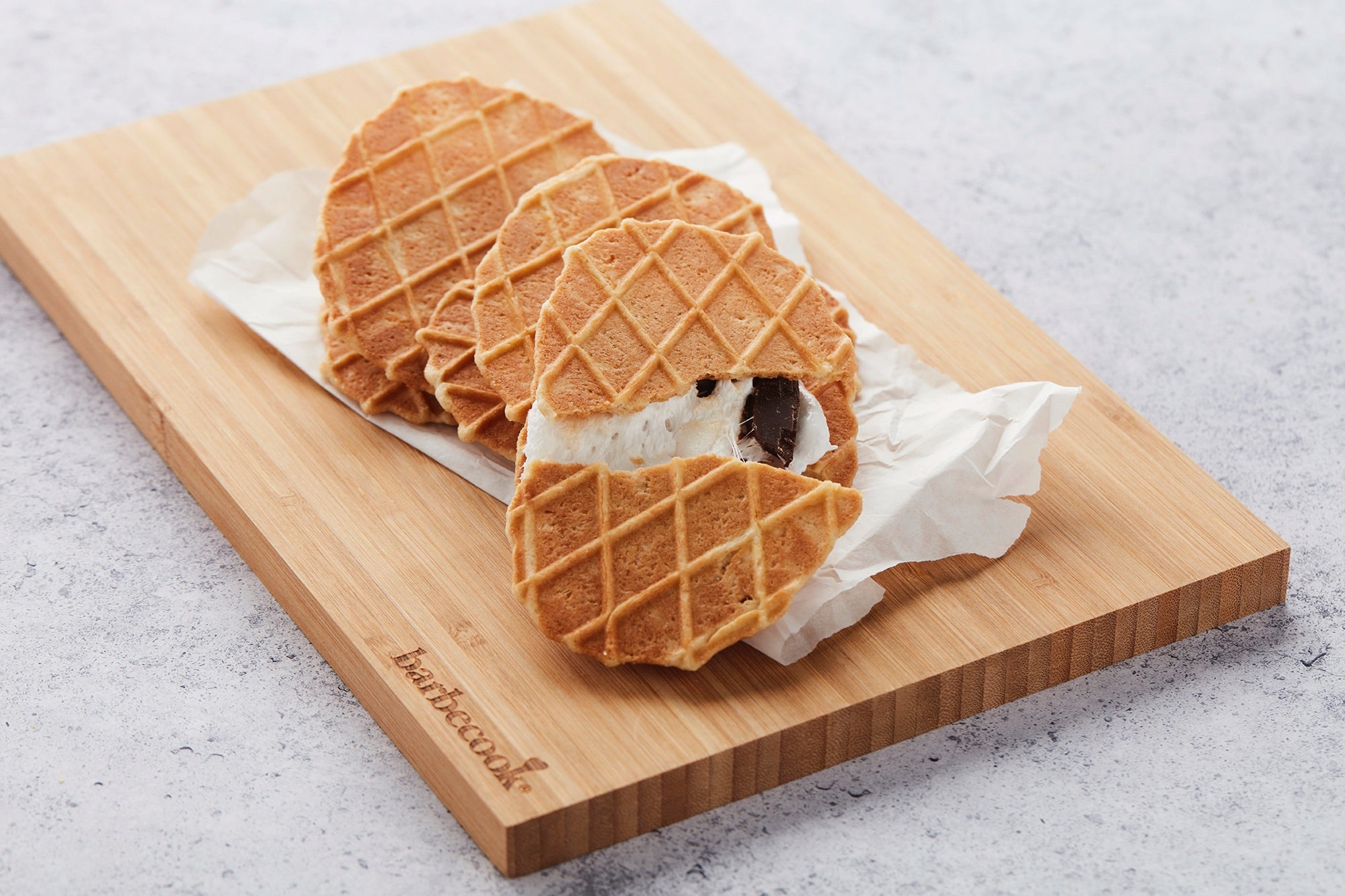 Prenez 2 biscuits et placez la plaquette de chocolat entre les deux. Dans cette recette, nous utilisons les mini gaufrettes de Jules Destrooper mais des biscuits au beurre type Petit Lu peuvent tout à fait convenir. Piquez un marshmallow sur une brochette Barbecook. Barbecook propose des brochettes en acier inoxydable, en chrome et en bambou. Le choix est vaste ! Veillez toujours à ne pas vous tenir trop près du feu. Tenez le marschmallow à environ dix centimètres au-dessus de la flamme et laissez-les lentement devenir fondants. Retournez régulièrement le chamallow jusqu'à ce qu'il prenne une belle couleur brun doré sur tous les côtés. Retirez ensuite le marshmallow chaud de la brochette et placez-le entre les biscuits recouverts de chocolat. Appuyez fermement sur le biscuit pour que le chocolat commence à fondre. C’est prêt !