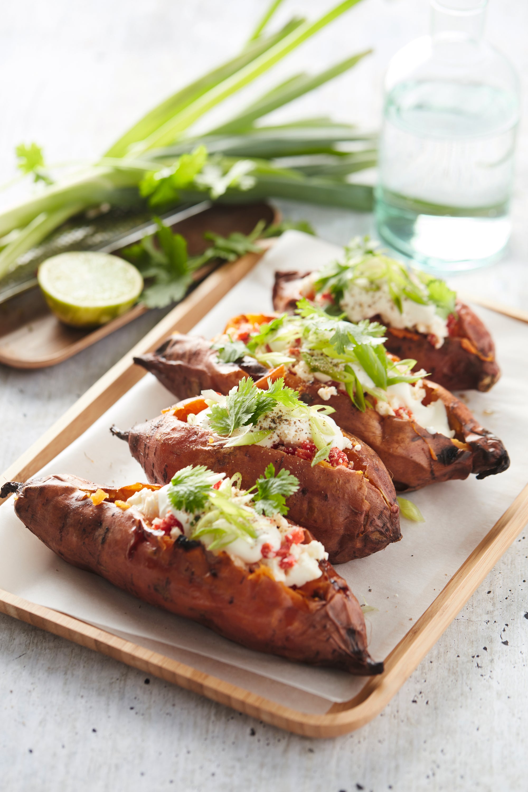 Pour commencer, sélectionnez quatre patates douces de taille similaire pour assurer une cuisson uniforme. À l’aide d’une fourchette, piquez la peau de chaque patate douce à quelques reprises, ce qui leur permettra d’absorber les saveurs fumées du barbecue. Frottez les patates douces avec de l’huile d’olive , puis enrobez-les généreusement d’un mélange de cumin moulu et de poudre de paprika . Ces épices infuseront les patates douces d’une chaleur et d’une profondeur subtiles qui se marient à merveille avec la garniture crémeuse à la feta. Enveloppez chaque patate douce individuellement dans du papier aluminium pour conserver l’humidité et placez-les à feu moyen sur le gril. Après environ 20 minutes, retournez-les et poursuivez la cuisson pendant 20 minutes supplémentaires, jusqu’à ce qu’elles soient tendres à cœur. Vous pouvez tester cela en les perçant doucement avec une brochette ou une fourchette!