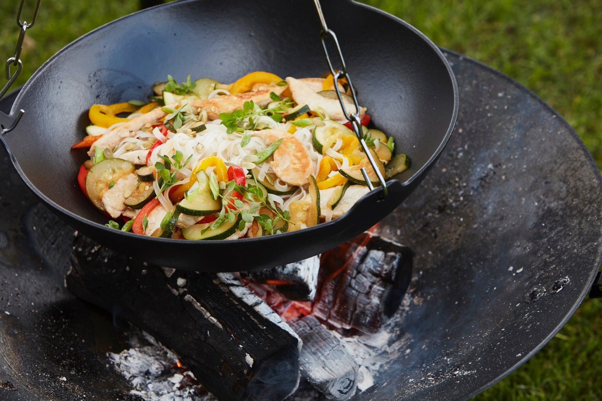 Pour la préparation du wok de lamelles de poulet, nouilles et légumes, nous utilisons le Junko de Barbecook. Ce barbecue en bois se compose d'un trépied, d'une cuve à feu et d'une poulie solide sur laquelle vous pouvez accrocher une grille, une marmite ou une poêle. Pour cette recette, nous utilisons une marmite Barbecook et une poêle wok en fonte émaillée.