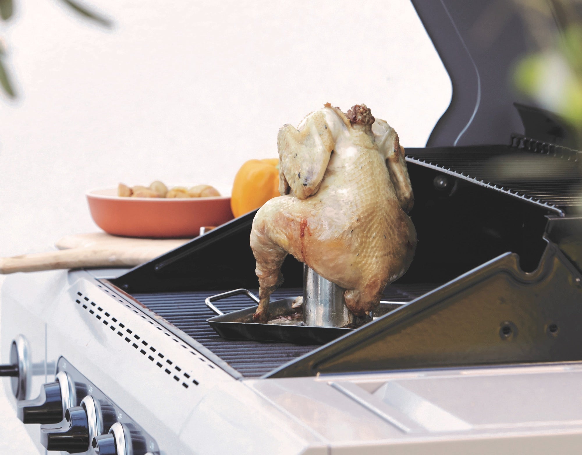 You can do endless things with barbecue, as we proved again with this fantastic 'chicken on a can' recipe, but what exactly does this term mean? You don’t have to look far, because it’s just what it is: chicken on a can. Chicken on a can? Yes, it’s possible! It’s a great way of giving your chicken delicious aromas and making it extra juicy! Initially, a can of beer was used for this purpose, with a chicken then slid over the opened can. Hence the synonym 'beer can chicken'. Today, there are numerous variations on the beer can chicken recipe. It’s also possible to experiment with liquids such as whisky, wine or even soft drinks like Fanta. I can already hear you thinking: whisky or wine are not served in cans, are they? We totally agree! That’s why Barbecook came up with an extra handy barbecue accessory: the Barbecook poultry roaster! You can fill this handy accessory with aromatics and drinks of your choice. The shape is similar to that of a can, so you can easily slide the rear end of your chicken over it!