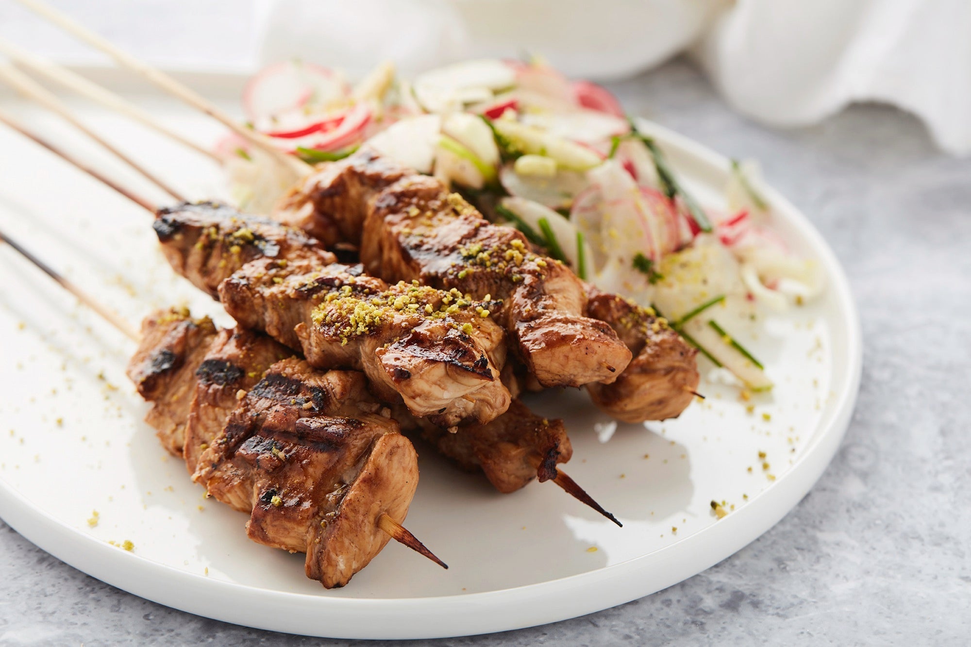 Remove the chicken skewers from the barbecue and serve with the fresh salad. Enjoy!