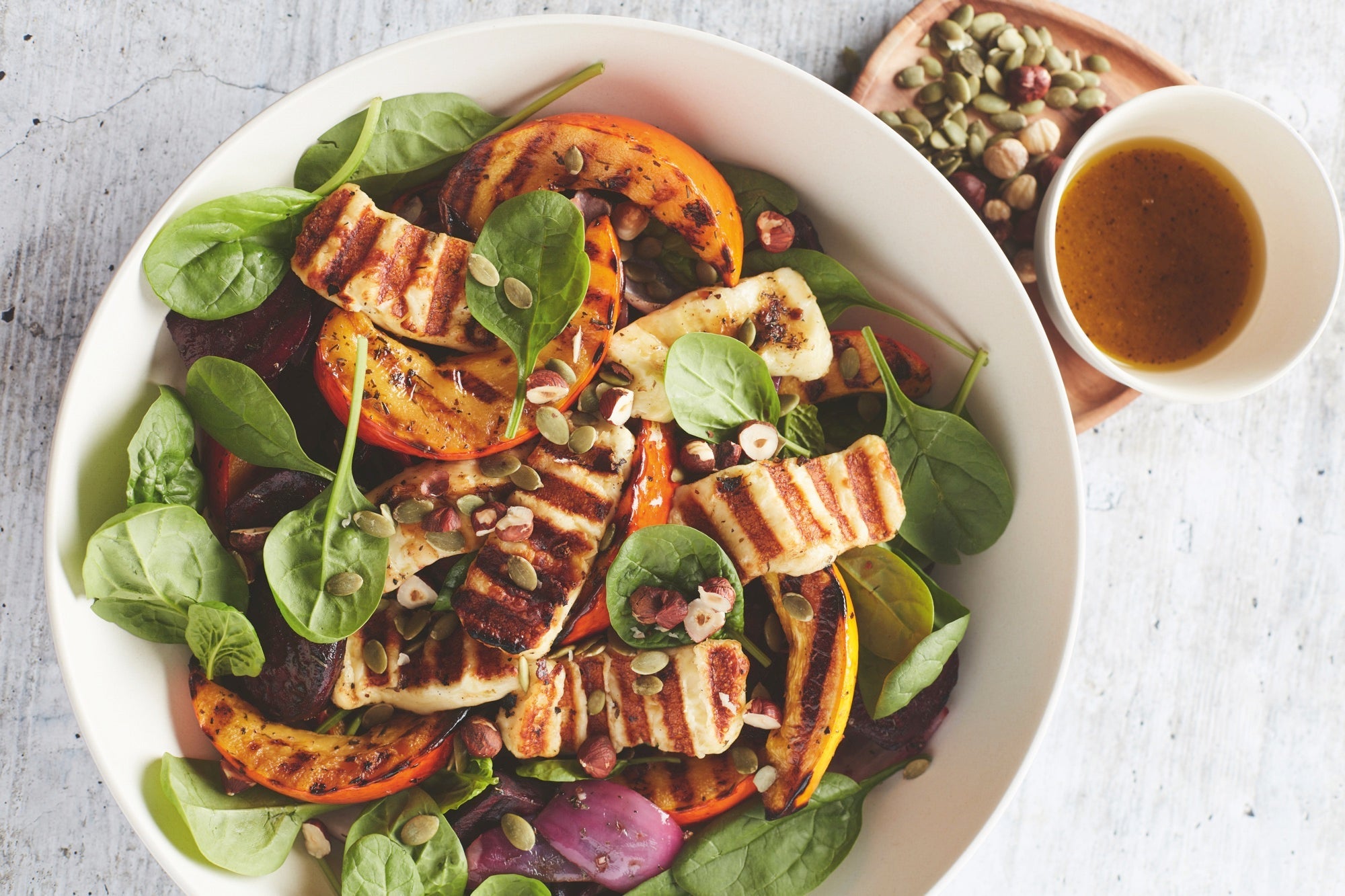 Mix the oil with the garlic and the Provencal herbs. Season with salt and pepper. Brush the pumpkin slices, beet slices, onion wedges and halloumi with the oil. Grill on the barbecue until tender. Mix the ingredients for the dressing. Assemble the salad with the spinach leaves, grilled vegetables and halloumi. Finish with the nuts, pumpkin seeds and some dressing.