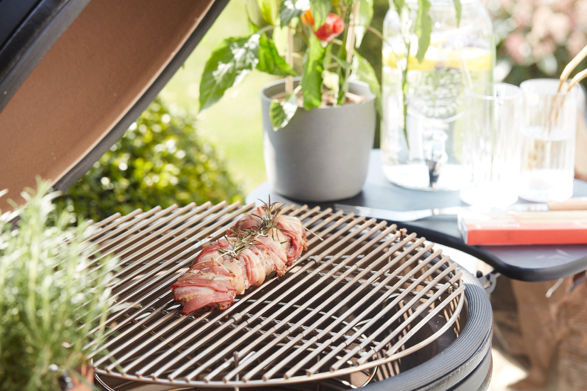 Once there is a thin layer of grey ash on your charcoal, sprinkle a handful of soaked wood chunks over the coals. This will give a delicious lightly smoked flavour. Then place the grid on your kamado BBQ and place the tied crow steak in the middle of the grid. Close the lid. Play with your air supply until you reach a temperature of about 180°C. Then close the air inlet to maintain an even temperature.
