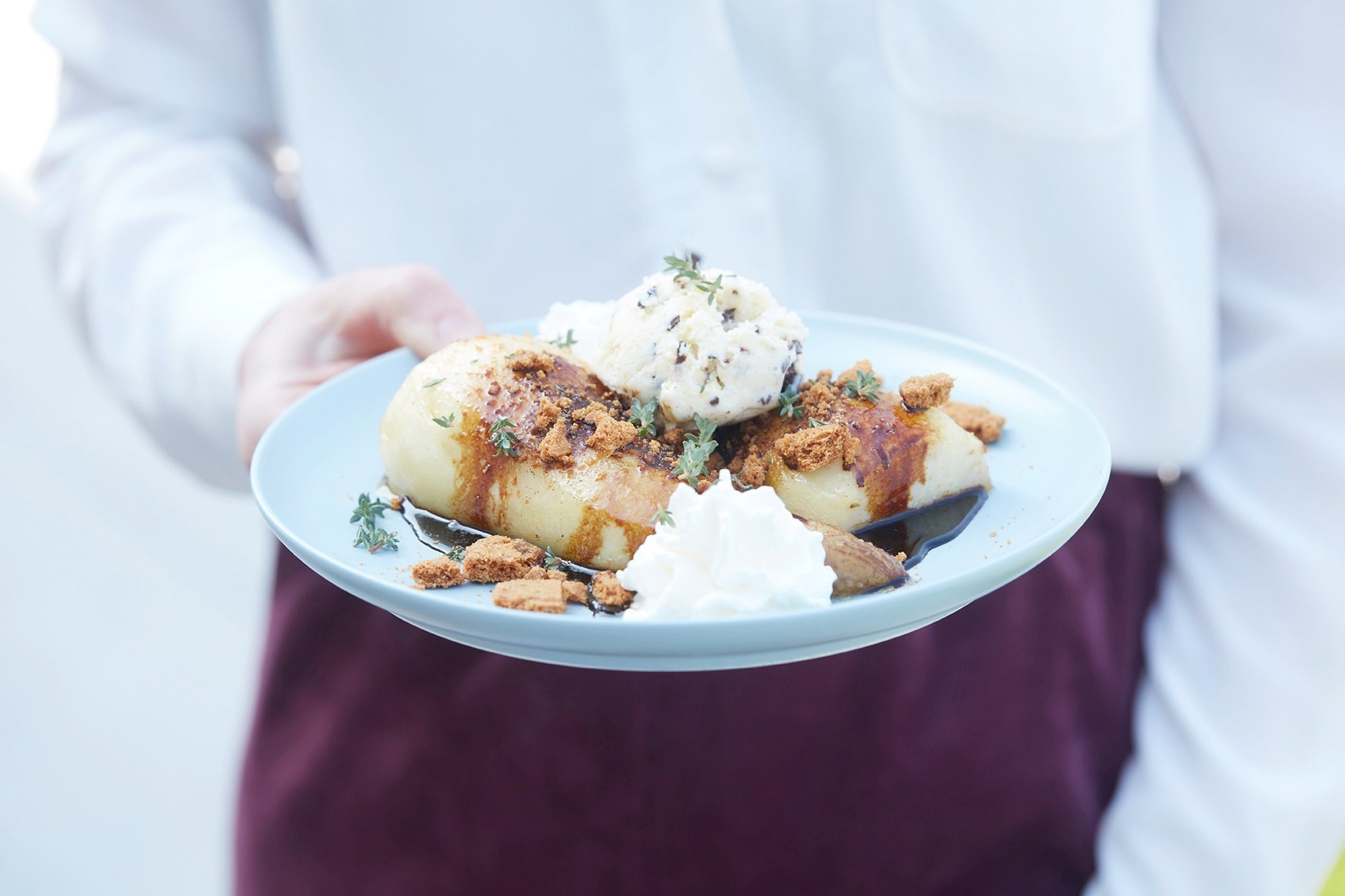 Remove the pears from the barbecue and serve the poire belle Hélène with a scoop of ice cream, the hot chocolate sauce and fresh whipped cream. Finish the poire belle Hélène with crumbled speculoos, roasted hazelnuts and lemon thyme.