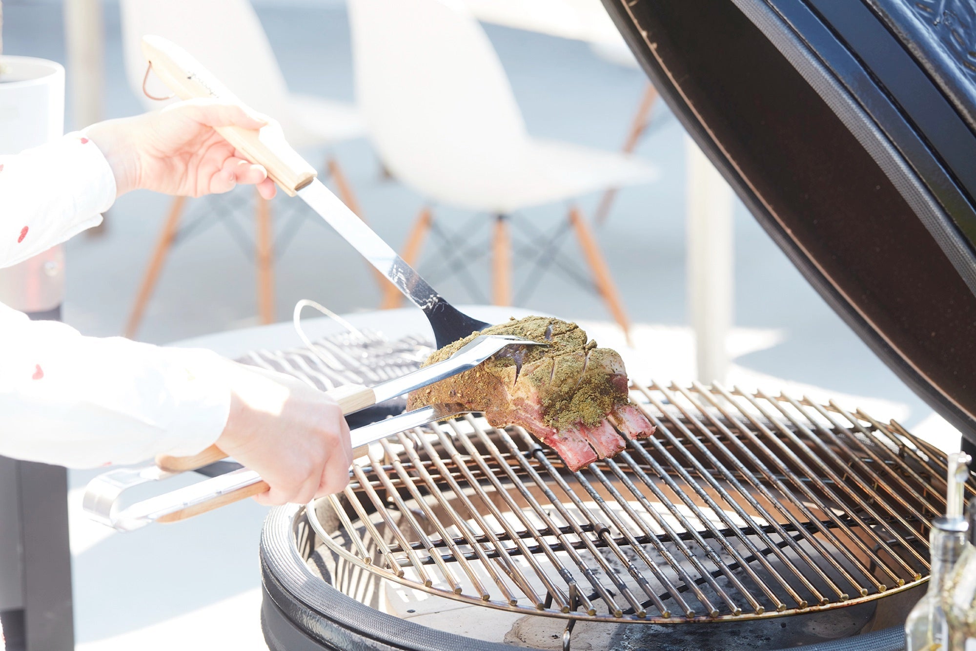 For this preparation of the pork crown roast, we use the Barbecook Kamal. Place the pork crown roast centrally on the barbecue grid and cook for 4 to 5 hours at a temperature between 110 °C and 130 °C. Place a bowl of Desperados next to the pork crown roast. To know when the pork crown roast is ready, we recommend using the Barbecook digital thermometer. When the pork crown reaches a core temperature of 60 °C, it’s ready. After grilling, cover the pork crown roast with aluminium foil and let it rest for a while.