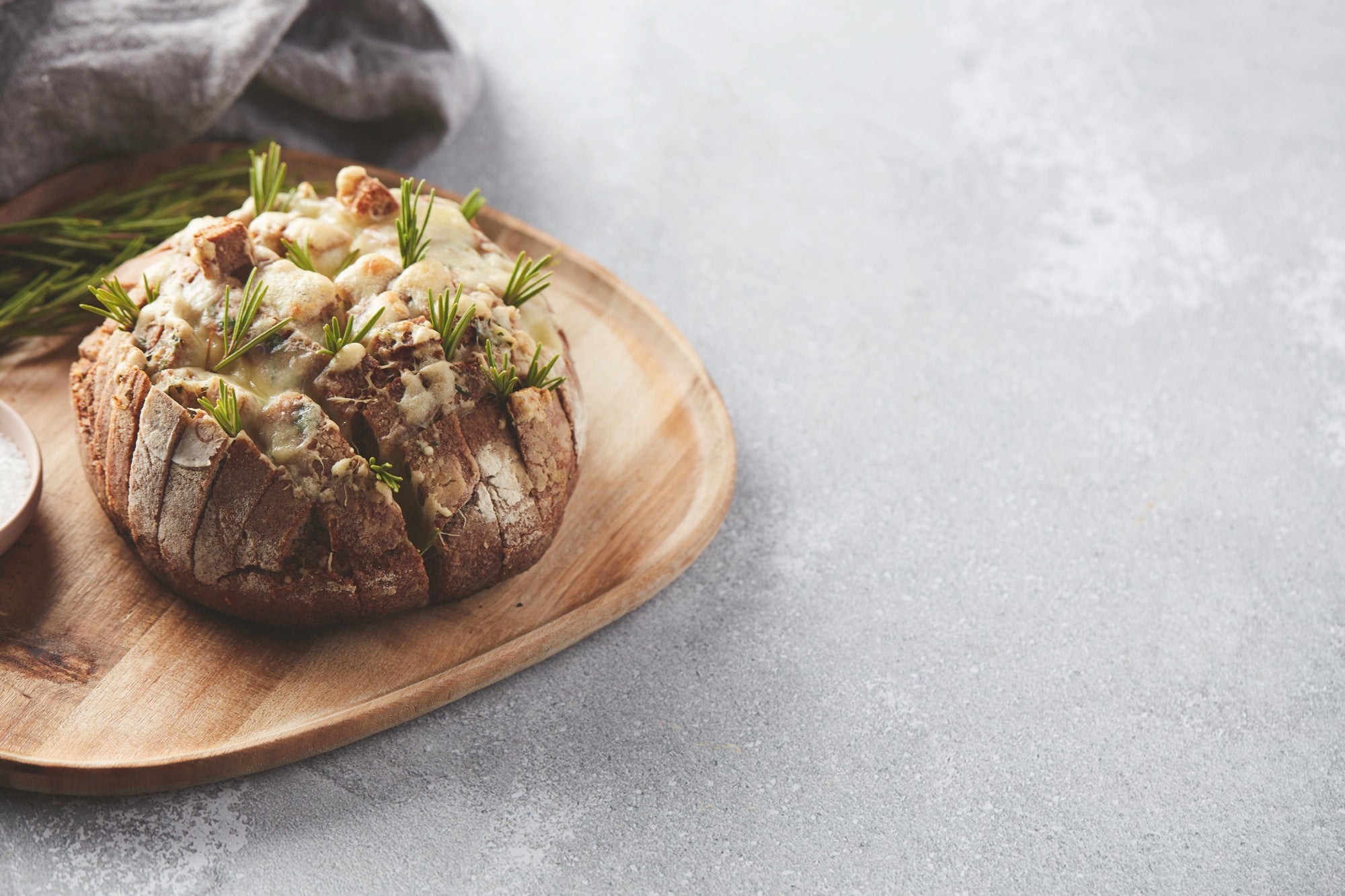 Spread all the slits of the bread with the melted herb butter. Then sprinkle the cheese into the slits. Tuck in some rosemary sprigs here and there.