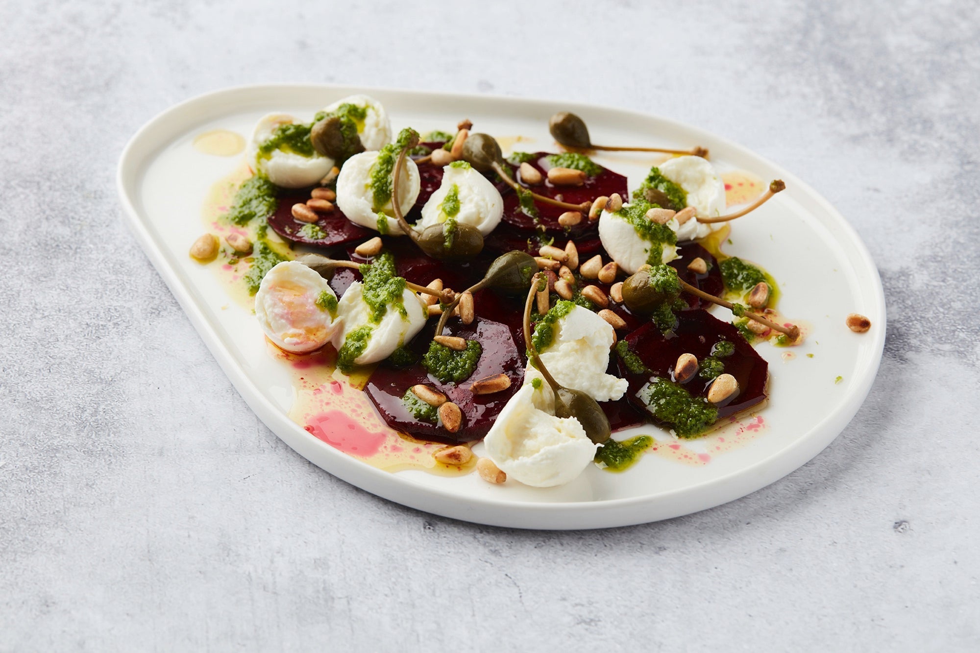 Arrange the smoked and marinated beets randomly on the plate. Pull the mozzarella into pieces and place with the beets. Finish with the basil oil, apple capers, lemon zest, black pepper and additional pine nuts. Serve with some French bread.