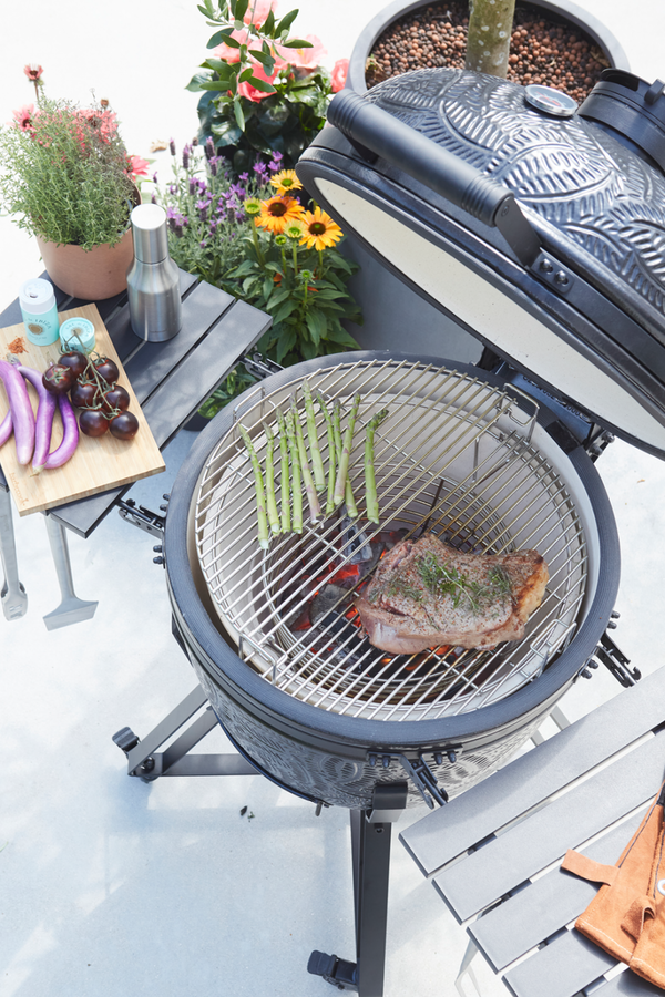 Finally, a kamado charcoal BBQ can be easily lit as follows: fill the stainless steel charcoal basket for about ½ with charcoal and light it with three fire starters. The air supply at the bottom must be fully open and the lid must also be open. The ceramic body around the basket (firepot) holds the heat perfectly and ensures that the flame is lit quickly.