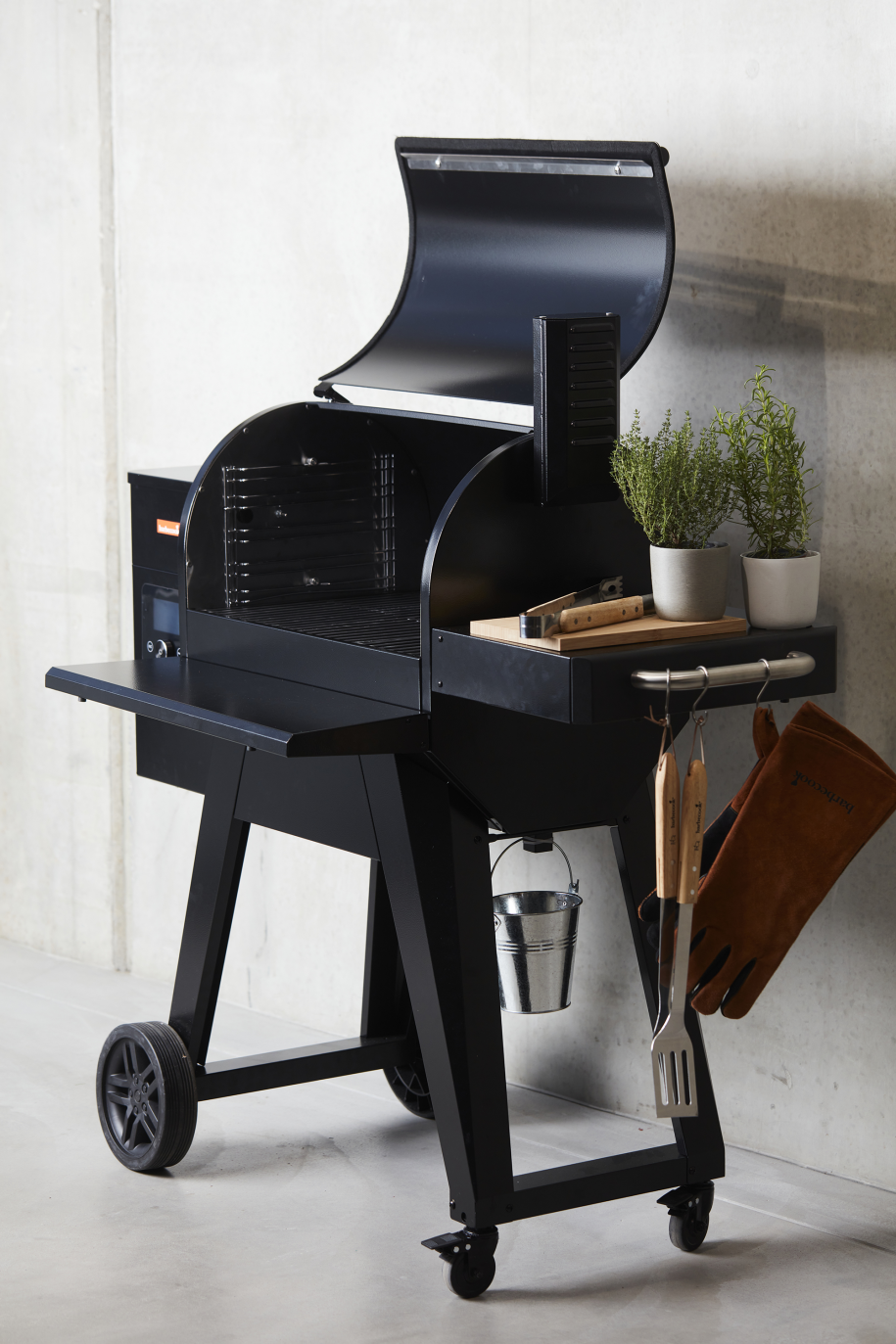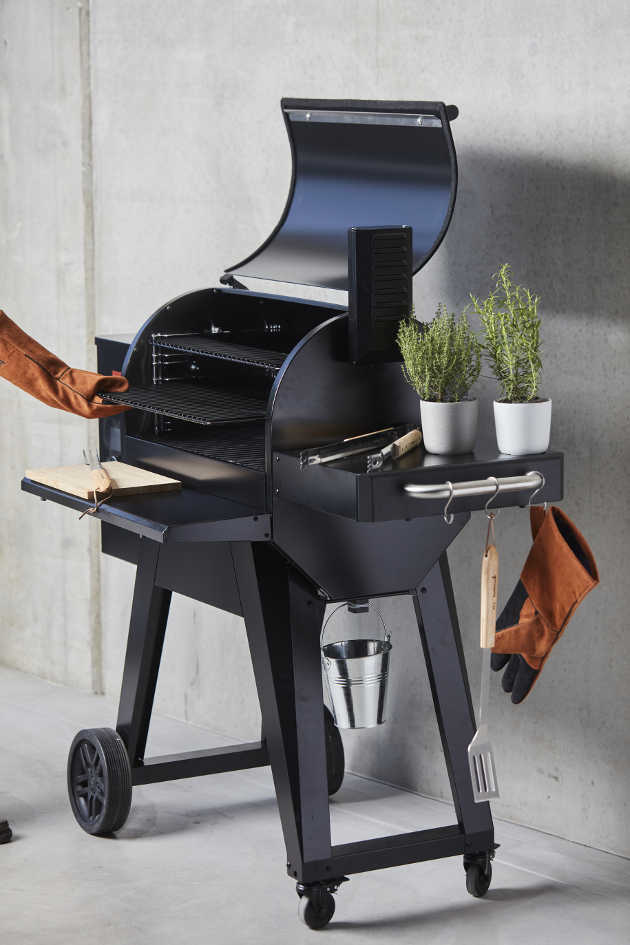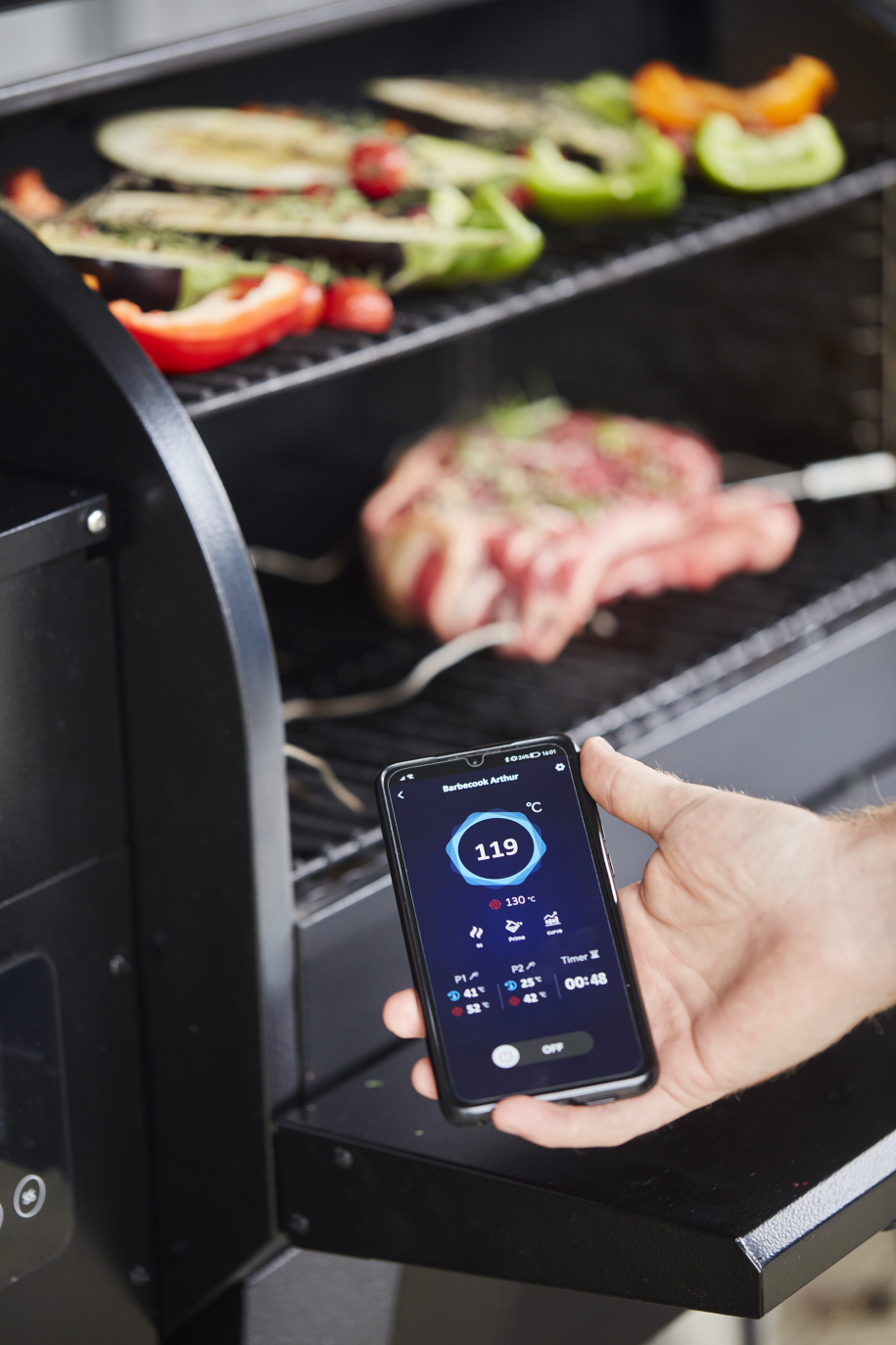 Barbecook Arthur is powered by food-safe wood pellets. To use the grill, simply fill the hopper, a storage container for pellets, with a capacity of 9kg. Depending on the temperature setting, this provides up to 20 hours of smoking or 10 hours of grilling.