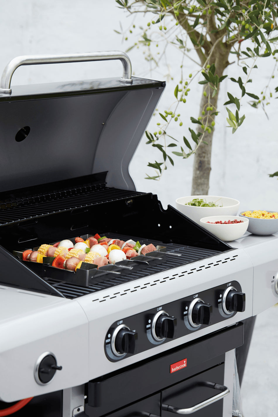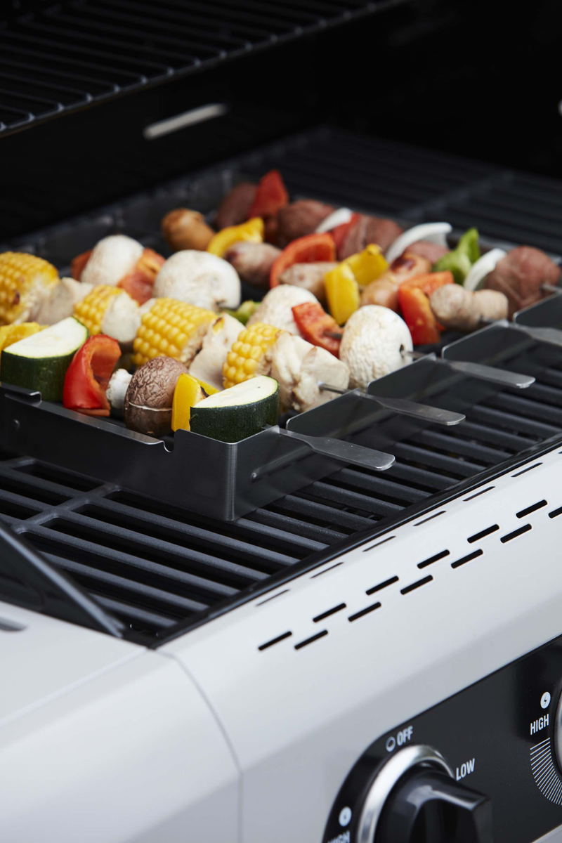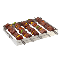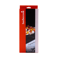 Barbecook vous propose un porte-brochettes en acier inoxydable dans lequel vous pouvez placer jusqu'à cinq brochettes. Ce support à brochettes convient aux barbecues au gaz et au charbon de bois. Le support est extrêmement facile à entretenir. Les dimensions de ce porte-brochette sont de 35,5 cm par 26,5 cm. Et si vous n’avez pas envie d’utiliser un porte-brochette ? Découvrez la gamme de piques à brochettes de Barbecook : en acier inoxydable avec un manche en bois, en chrome avec un manche en bois, entièrement en acier inoxydable ou en bambou. Vous avez l’embarras du choix !