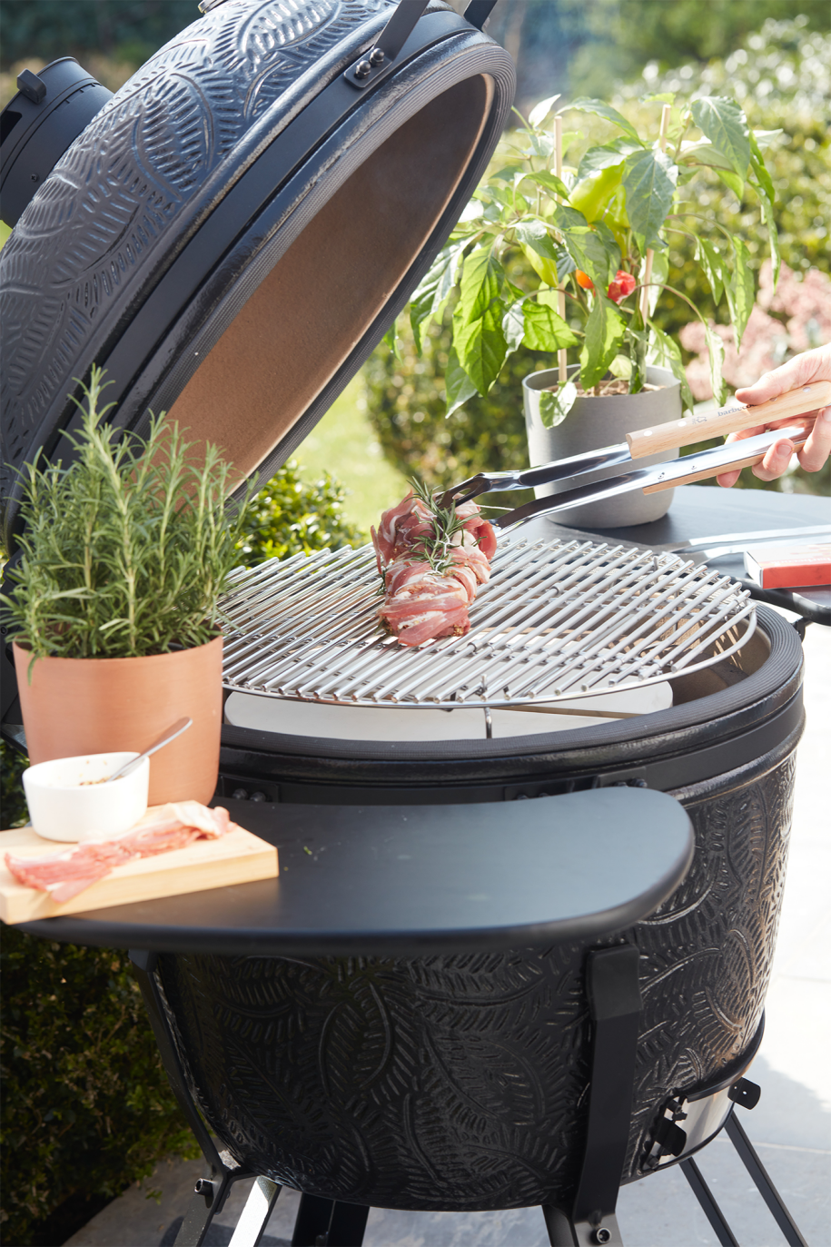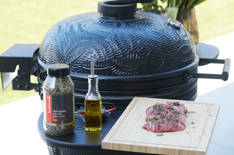Le barbecue kamado Kamal est équipé d'une grille en acier inoxydable sur laquelle vous pouvez préparer de nombreux plats différents. Cependant, vous pouvez également améliorer ce barbecue céramique très facilement. Divers accessoires peuvent être fixés au grill kamado pour élargir les possibilités. À l'intérieur du barbecue céramique Kamal se trouve un support spécial dans lequel deux demi-cercles de céramique peuvent être placés. Ceux-ci forment une sorte de barrière entre la chaleur directe du charbon de bois et votre préparation et sont donc utilisés pour les grillades « indirectes ». Ils sont idéaux, par exemple, lorsque vous voulez que votre préparation cuit lentement. Si vous retirez les demi-cercles, votre préparation sera en contact direct avec la chaleur du charbon de bois et vous grillerez « directement ». En outre, vous pouvez fixer un système de cuisson flexible dans votre grill kamado qui vous permet de placer deux demi-grilles chacune à une hauteur différente et ainsi ajuster votre technique de cuisson en fonction des ingrédients à préparer. En plus des grilles en acier inoxydable, vous pouvez même utiliser des (demi) grilles en fonte. En outre, il est également possible d'utiliser le barbecue kamado Kamal pour fumer des ingrédients, faire mijoter des marmites ou même préparer des pizzas. Beaucoup de possibilités !