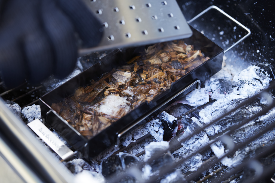 Une boite de fumage ou smoker box est utilisée en combinaison avec un barbecue muni d'un couvercle. Le couvercle veille à ce que la fumée ne s'échappe pas mais circule à l'intérieur de votre barbecue et imprègne vos préparations d'un goût fumé. On parle ici de barbecue indirect. Tout d'abord, choisissez la saveur de fumage que vous voulez donner à vos ingrédients. Cela dépend du type d’ingrédients que vous mettez sur le gril. Par exemple, si vous préparez du poisson, les copeaux de fumage de citron sont le choix idéal. Si vous préparez du poulet, choisissez des copeaux de chêne ou de pomme. Vous pouvez vous renseigner sur les types de copeaux de fumage à utiliser ici. Il est important de faire tremper les copeaux de fumée dans l'eau avant de les mettre dans la boite de fumage. Si vous ne le faites pas, vous risquez d'obtenir un goût fumé très amer. Assurez-vous quand même que vos copeaux ne soient pas totalement détrempés sinon, le trop plein d’eau va s’évaporer au lieu que vos copeaux fument. Grâce à la chaleur de votre barbecue, le bois de la boite de fumage deviendra incandescent après environ 10 à 20 minutes et de la fumée se dégagera. Cette fumée sortira par les trous du couvercle et se répandra à l'intérieur du barbecue. La fumée sera ensuite lentement absorbée par les différents ingrédients placés dans le barbecue. Attention ! Ne placez jamais les ingrédients directement sur le dessus de la boite de fumage. Pour les préparations qui doivent être cuites indirectement sur le barbecue pendant une longue période, vous pouvez remplir la boîte à la fois avec des copeaux de fumage. Cela garantit un enfumage constant.