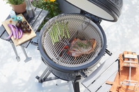 Commencer avec le Kamal est un jeu d'enfant : ses quatre roues robustes permettent un transport facile du rangement au patio. Remplissez le panier à charbon à moitié, allumez-le avec quelques allume-feux, ouvrez complètement l'entrée d'air en bas et laissez le couvercle ouvert. L'enveloppe en céramique autour du panier à charbon retient la chaleur et aide à allumer la flamme rapidement. Une fois que les charbons ont une couche de cendres grises, vous êtes prêt à faire un barbecue !