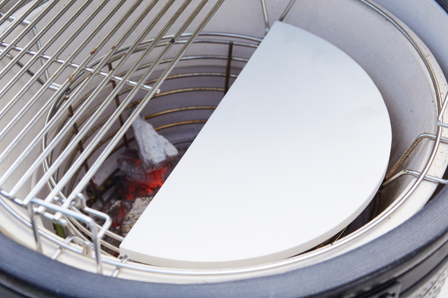 Le Kamal régule efficacement et maintient la chaleur grâce à sa construction en céramique à base de mullite. Ce matériau assure une bonne rétention de chaleur, permettant aux charbons de brûler de manière continue et de maintenir une température idéale. Avec un couvercle qui se ferme hermétiquement grâce à un joint en maille métallique durable et des ressorts en acier inoxydable, la chaleur, la fumée et les saveurs sont parfaitement préservées. Cuisiner avec le Kamal est relaxant et simple : ajustez la température pendant la cuisson en manipulant l'entrée d'air en bas et le clapet supérieur en haut.